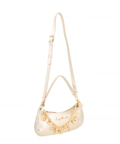 Bolsa que traz uma nova interpretação aos elementos românticos como informações marcantes de moda. O modelo é produzido em couro metalizado dourado, possui corrente frontal com charms pendurados um compartimento interno, alça fixa de mão, alça removível e ajustável tiracolo e fechamento superior por zíper.