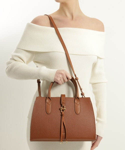 A tote grande une praticidade e elegância em um design clássico. Com amplo espaço interno e alças versáteis, é ideal para o dia a dia. As tiras frontais com detalhe metálico adicionam charme e sofisticação ao acessório.