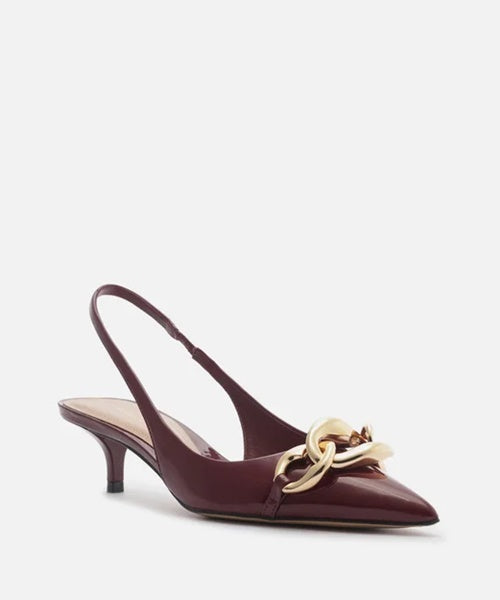 O scarpin com tira slingback possui um design minimalista, vem com elos metálicos imponentes e acabamento glossy, expressando as tendências da temporada. Cria looks elegantes e insere sofisticação nas produções.