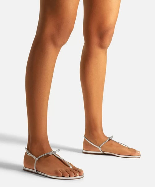 Descrição: Sandália rasteira feminina prateada em verniz. O modelo slim tem sola flat e bico redondo. Traz tira fina que passa entre os dedos, conectada a mais uma tira fina no peito do pé com aplicação de laço pequeno. Possui ainda tira fina em torno do calcanhar com fecho em fivela metálica lateral. Com palmilha da cor do modelo e inscrição do nome da marca. Aberta, a sandália exibe todo o pé.