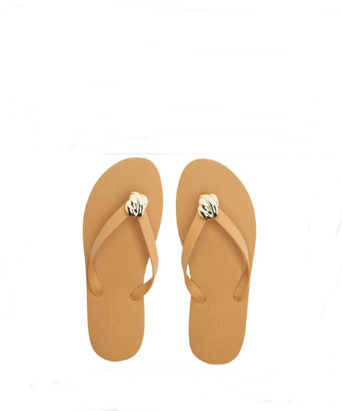 Descrição: Chinelo de dedo caramelo. O sapato tem sola rasteira flat emborrachada e palmilha texturizada com inscrição do nome da marca. Com formato arredondado na ponta, traz tiras lisas que dividem os dedos, com aplicação de metal dourado texturizado no centro. Aberto, o chinelo de dedo exibe todo o pé.