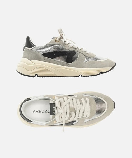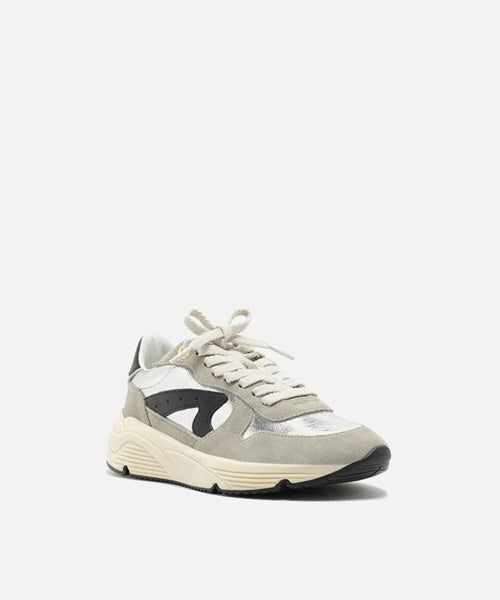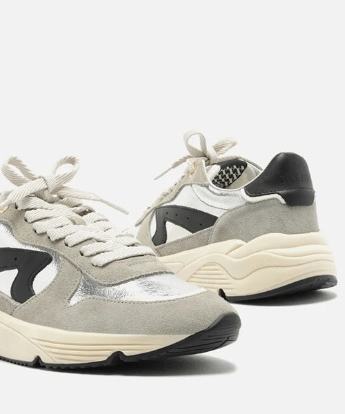 Descrição: Tênis feminino cinza em camurça. O sapato tem sola baixa, esportiva, emborrachada e branca, com relevo e base levemente tratorada preta. Traz recortes no cabedal e aplicações em couro prata e preto. Com formato arredondado na ponta, o tênis tem fecho em cadarços brancos e etiqueta cinza do nome da marca na língua. Acompanha tag emborrachada verde com gravação preta, presa ao atacador por tira.