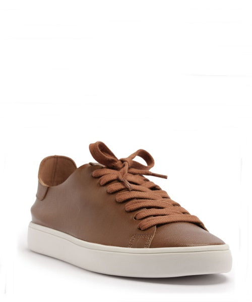 Descrição: Tênis feminino marrom de couro. O sapato tem sola baixa emborrachada branca. Traz aplicação no calcanhar. Com formato arredondado na ponta, o tênis tem fecho em cadarços marrons e tag do nome da marca na língua.