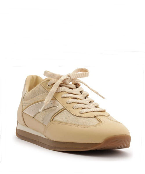 Descrição: Tênis feminino palha em couro e camurça. O sapato tem sola baixa, emborrachada e branca, com base marrom e detalhe traseiro. Traz recortes no cabedal e aplicações em couro rosa nas laterais e no calcanhar. Com formato arredondado na ponta, o tênis tem fecho em cadarços brancos e nome da marca na língua, que é texturizada.