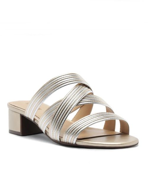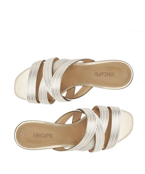 Sandália mule de salto bloco, na cor prateada. O modelo apresenta cabedal em material similar ao couro, com tiras mais largas - uma sobre os dedos - duas que se cruzam em X e uma sobre o peito de pé, com design de efeito bombado e pespontado nas tiras. De biqueira quadrada, possui salto em bloco médio e palmilha comfy, com assinatura Anacapri. Aberta atrás, a sandália mule deixa os dedos e calcanhar à mostra.