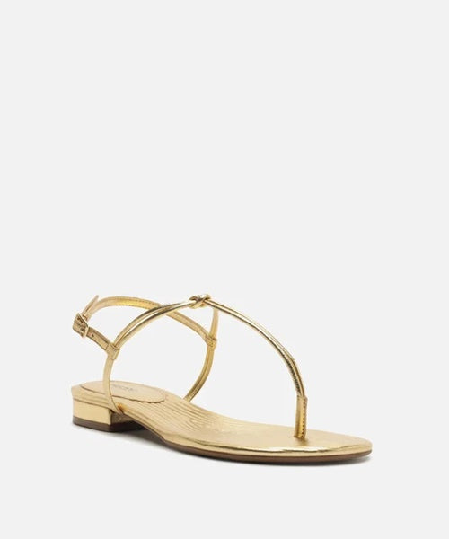 Descrição: Sandália dourada. O sapato slim tem salto mínimo bloco e formato arredondado na ponta. Traz tiras finas que se encontram no centro com detalhe em enlace, além de tira que divide os dedos e tira fina em torno do calcanhar com fecho lateral em fivela metálica. Com palmilha dourada e inscrição do nome da marca. Aberta, a sandália exibe todo o pé.