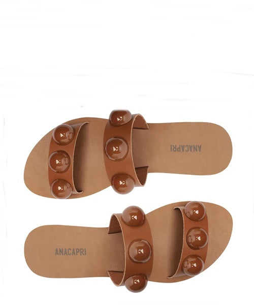 Rasteira Pop de tiras paralelas em couro, com detalhe em esferas, na cor marrom. O modelo possui solado rasteiro e emborrachado, com leve saltinho traseiro. De biqueira arredondada em couro, apresenta cabedal com duas tiras largas e paralelas - uma sobre os dedos e a outra sobre o peito de pé - com aplicação de trio de maxi esferas do mesmo tom da rasteirinha, sobre as tiras. Com assinatura Anacapri na palmilha marrom. Aberta, a rasteirinha exibe todo o pé.
