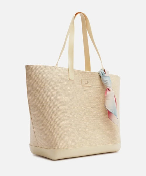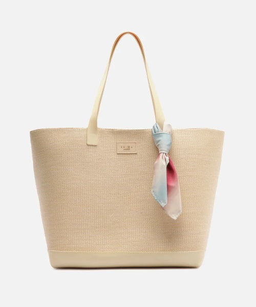 Descrição: Bolsa shopping grande em material tramado bege com base em PVC off-white. De formato estruturado, o acessório traz duas alças de ombro, fechamento superior em zíper e etiqueta Brizza aplicada na parte frontal. Vem acompanhada de lenço colorido amarrado a uma das alças.