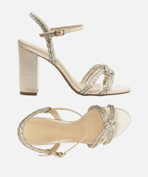 Sandália Dourada Salto Alto Trançada Mix Nó -