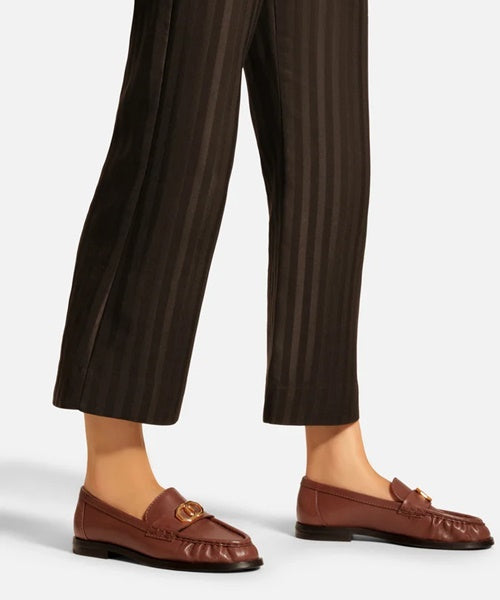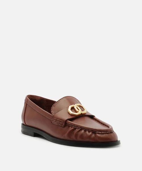 Descrição: Mocassim feminino marrom de couro. O sapato tem salto rasteiro e formato arredondado na ponta. Fechado, traz recorte lateral na gáspea e aplicação de tira larga com peça metálica geométrica sobre o cabedal. Possui costura marcada no contorno da biqueira e detalhe franzido na parte frontal. Exibe toda a parte superior do pé.