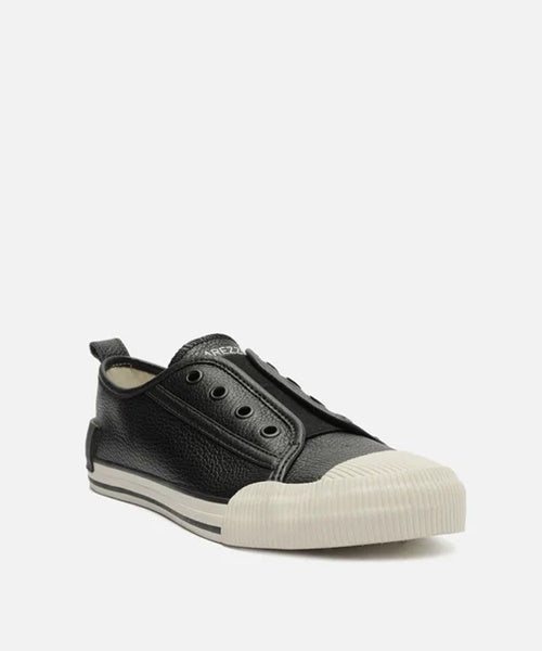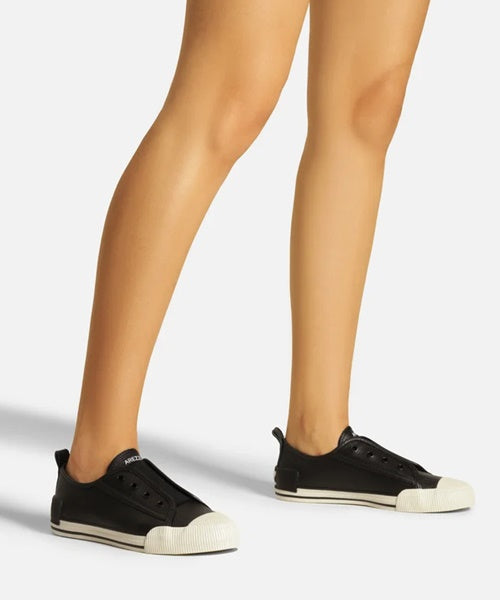 Descrição: Tênis slip on preto de couro. O sapato tem solado baixo emborrachado branco, com frente e biqueira texturizadas e risca lateral preta. Traz tira com puxador no calcanhar, que facilita o calce. Com formato arredondado na ponta, o tênis tem elástico sobre a língua, terminal do cadarço com ilhós decorativos e tag emborrachada do nome da marca na parte traseira.