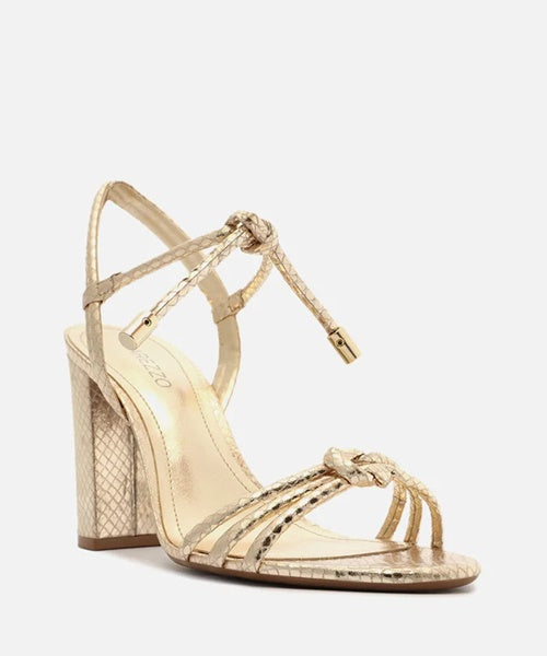 Descrição: Sandália dourada com textura snake. O modelo tem salto alto bloco e bico redondo. Traz três tiras finas e trançadas sobre os dedos, unidas por enlace central. Possui tira fina em torno do calcanhar e mais duas tiras trançadas no tornozelo com ponteiras metálicas e fecho em nó frontal. Com palmilha da cor do modelo e inscrição do nome da marca. A sandália exibe todo o pé.
