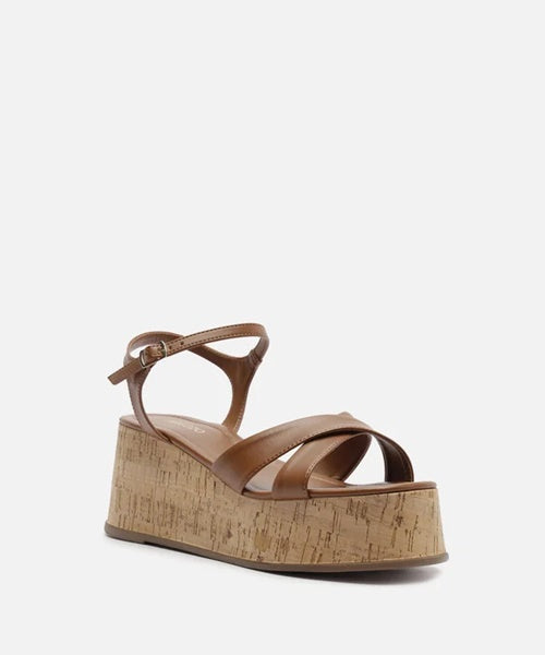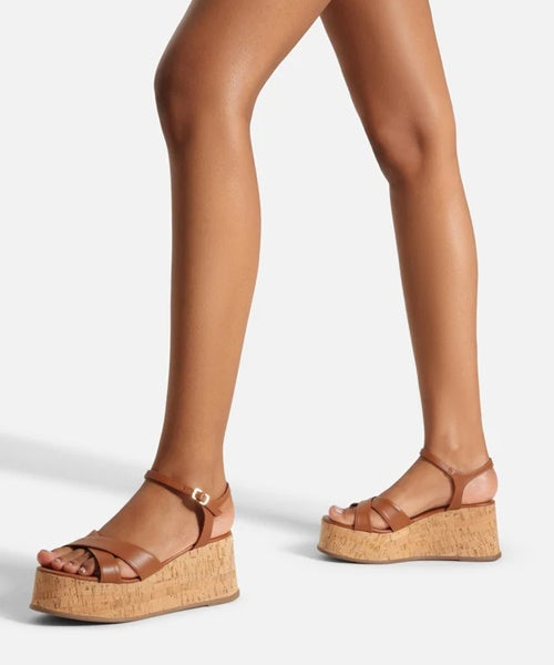 Descrição: Sandália marrom. O sapato tem salto médio plataforma revestido em cortiça e formato arredondado na ponta. Traz duas tiras cruzadas sobre os dedos e tira fina afivelada no tornozelo, conectada ao calcanhar. Com palmilha marrom e inscrição do nome da marca. Aberta, exibe todo o pé.