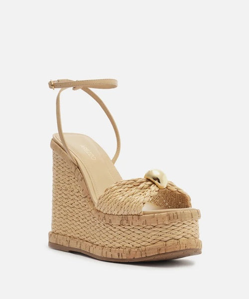 Descrição: Sandália bege em palha. O sapato tem salto alto plataforma e anabela, revestido em palha tramada e com contorno superior e inferior em cortiça, além de formato quadrado na ponta. Traz tira larga sobre os dedos em palha tramada e com detalhe em metal dourado, espesso e orgânico preso no centro. Possui tira fina que sai das laterais, cruza no calcanhar, contorna o tornozelo e fecha em fivela lateral. Com palmilha bege e inscrição do nome da marca.