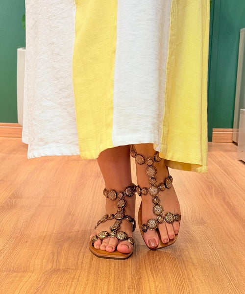Acabamento impecável e design único que valoriza cada detalhe. Uma sandália elegante, cheia de personalidade, para elevar qualquer produção com muito estilo.