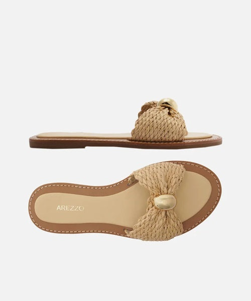 A sandália slide que é a cara da estação! O modelo aposta no mix de palha com o metal bold e combina com as mais diversas peças, do jeans à alfaiataria, criando um look despojado e comfy.