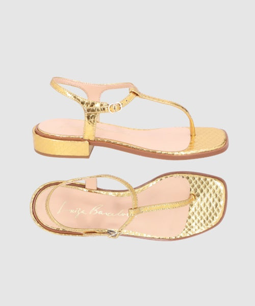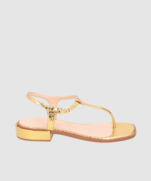 NOME: SANDÁLIA RASTEIRA EM COURO COBRA DOURADA COM TIRA DE DEDO