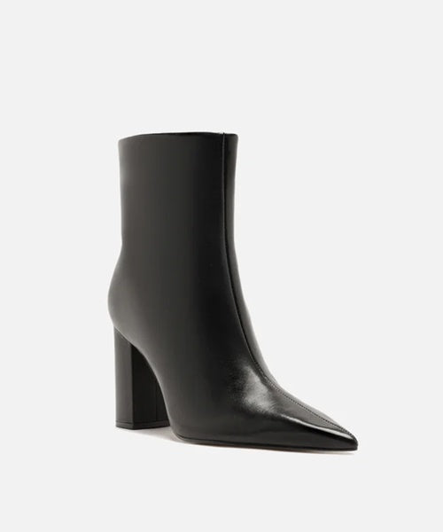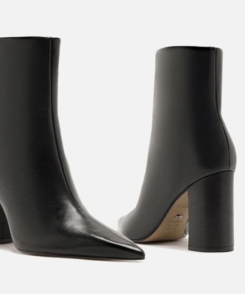 Descrição: Bota feminina preta em couro. O sapato tem cano curto, salto alto bloco e ponta fina. Traz cabedal ajustado ao pé e fecho em zíper na lateral interna do cano.