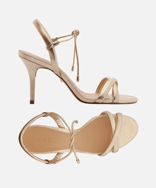 Descrição: Sandália dourada metalizada. O modelo tem salto médio fino e bico redondo. Traz duas tiras finas bombadas cruzadas sobre os dedos e mais uma em torno do calcanhar. Com duas tiras finas no tornozelo, que fecham em amarração. A sandália exibe todo o pé.