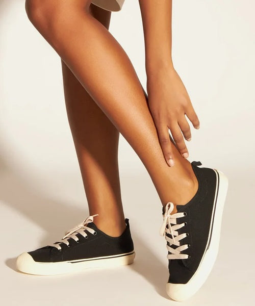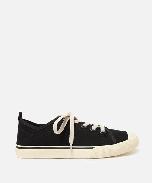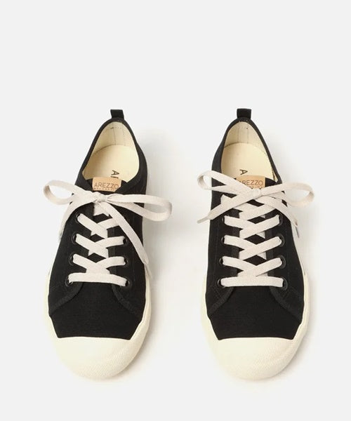 Descrição: Tênis de amarrar ZZ Play em lona na cor preta e cadarço na cor branca. De salto rasteiro na cor off white com uma listra preta na parte superior, possui solado vulcanizado, tira de gorgurão vermelho na parte traseira do tênis facilitando o calce.