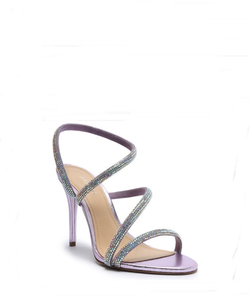 A sandália surge com design moderno, seguindo as tendências da temporada. O modelo destaca as tiras curvadas em strass e insere um toque sofisticado e glam em qualquer produção.