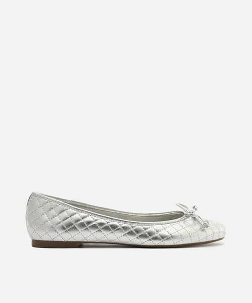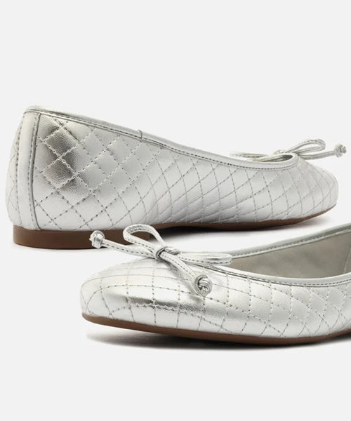 Descrição: Sapatilha de salto rasteiro metalizada. De bico redondo, com cabedal entrelaçado em costuras matelassê e aplicação de laço pequeno delicado de mesmo tom no cabedal.
