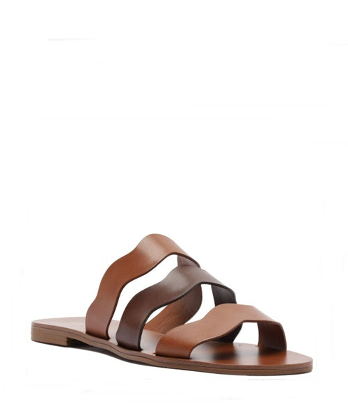 Descrição: Sandália rasteira marrom em couro. O sapato tem sola flat e três tiras médias, com recorte curvo e em tons de marrom, bege e Off-white sobre os dedos e a parte superior do pé. Com formato arredondado na ponta, é aberta e exibe todo o pé. Com base emborrachada, palmilha lisa marrom e inscrição do nome da marca.