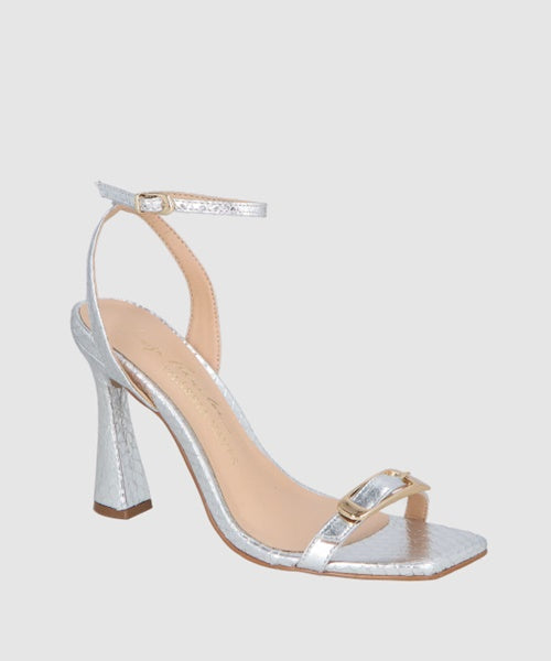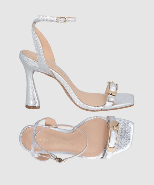 Combinando o charme atemporal de Luiza Barcelos com o toque moderno de Thássia Naves, esta collab é a definição de luxo e delicadeza. A sandália em salto alto flare em courometalizado prata apresenta tira delicada que contrasta com o impacto da fivela, criando um equilíbrio perfeito entre sofisticação e descontração. Com bico quadrado e fechamento ajustável no tornozelo, é a escolha perfeita para composições elegantes e contemporâneas.
