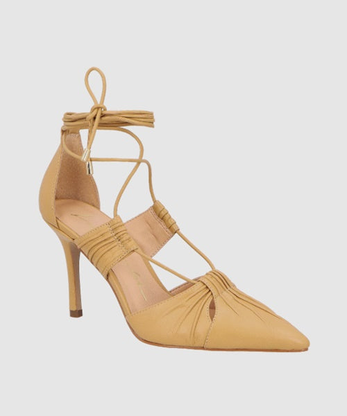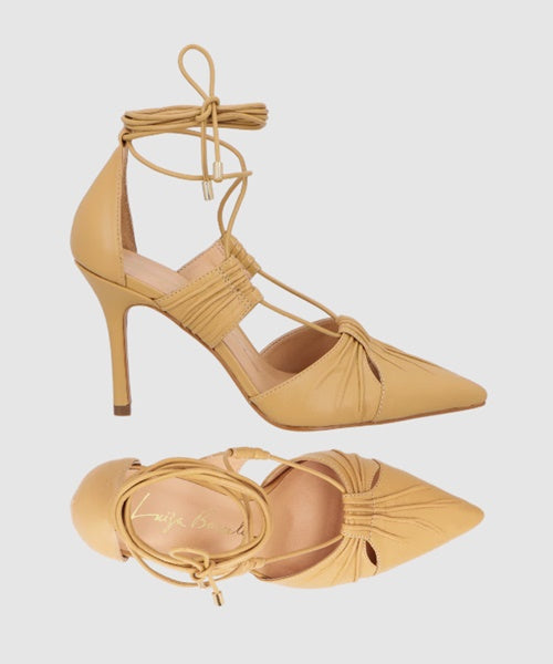 O scarpin em couro no tom de bege areia traduz sofisticação em um design moderno e feminino. O modelo apresenta bico fino, salto alto fino e tiras delicadas com efeito drapeado, finalizadas por amarração no tornozelo que valoriza a silhueta. Uma peça que equilibra elegância e atitude, resultando em um calçado versátil e cheio de estilo para produções contemporâneas.