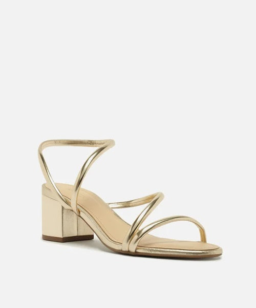 Descrição: Sandália dourada. O sapato tem salto médio bloco e formato arredondado na ponta. Traz uma tira sobre os dedos e outra na parte superior do pé, na diagonal. Possui ainda tira que sai da lateral e contorna o tornozelo. Aberta, a sandália exibe todo o pé. Com palmilha bege e inscrição do nome da marca.